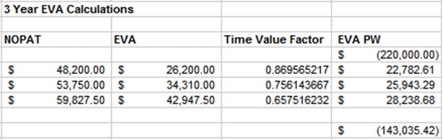 Upon initial examination, the TVM calculations looked favorable, with a present worth cash flow value of over $85,000 during the target 5 year time horizon. Next, they proceeded to calculating the EVA.